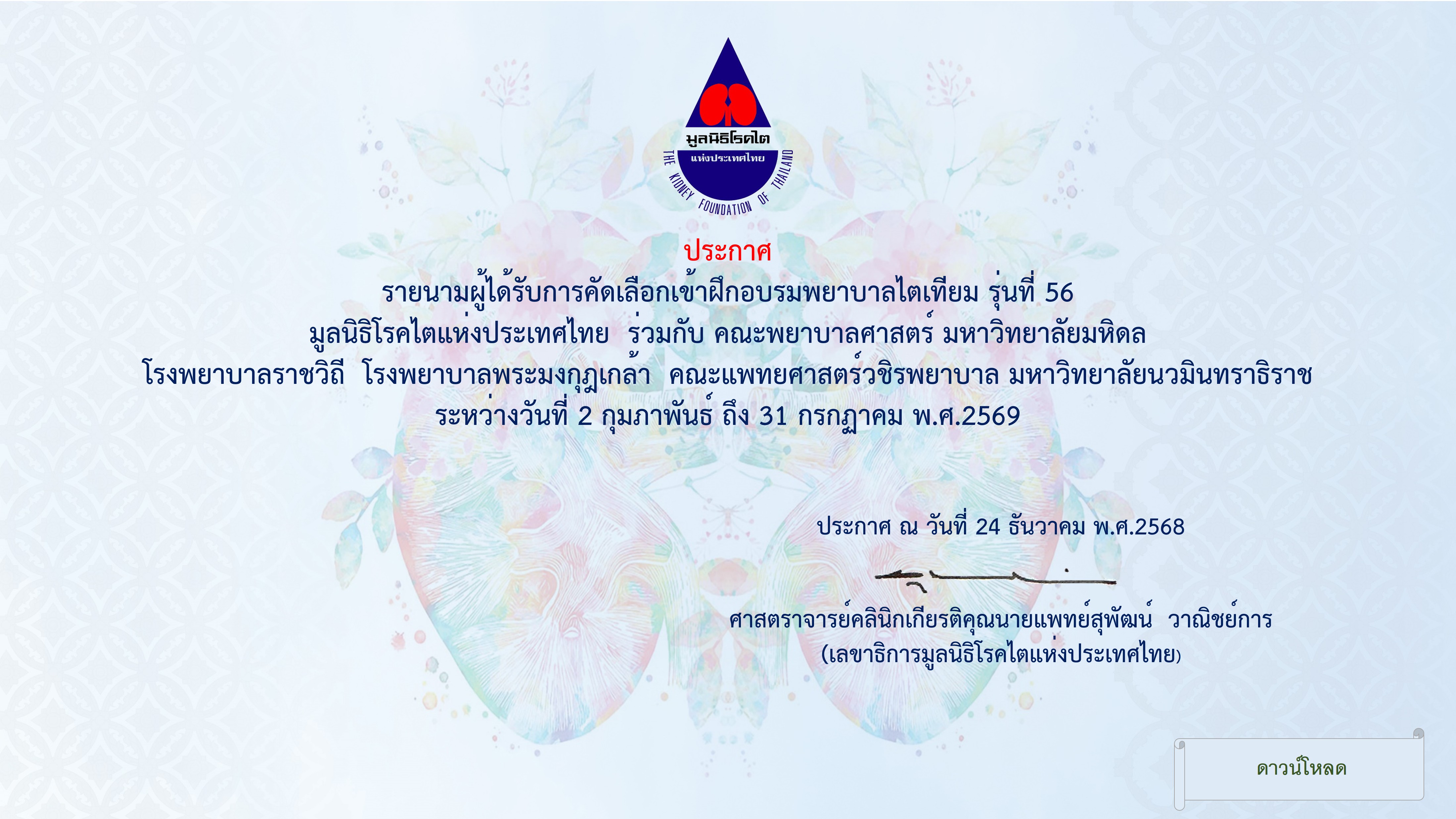 ประกาศรายนามผู้ได้รับการคัดเลือกเข้าฝึกอบรมพยาบาลไตเทียม รุ่นที่ 56 ประกาศ ณ วันที่ 24 ธันวาคม 2568