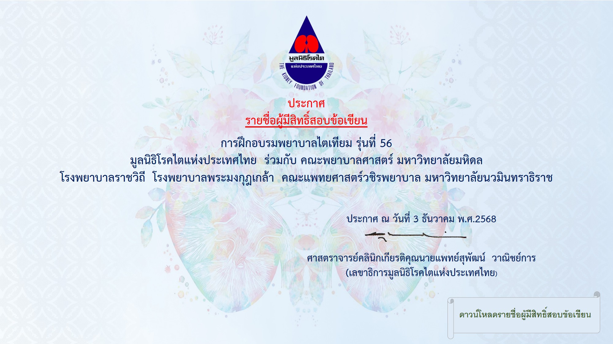 ประกาศรายชื่อผู้มีสิทธิ์สอบข้อเขียน การฝึกอบรมพยาบาลไตเทียม รุ่นที่ 56 ประกาศ ณ วันที่ 03 ธันวาคม 2568